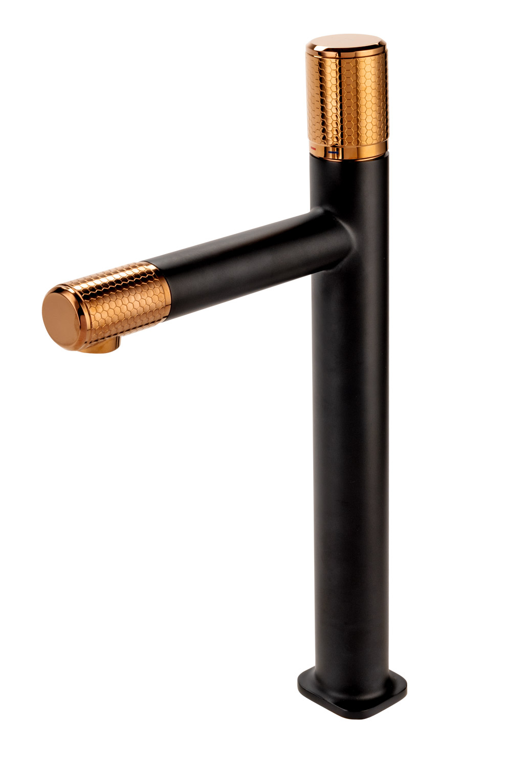Bateria ARDESIA pentru lavoar inalt adauga o nota eleganta zonei lavoarului. Acest model se distinge prin forma sa ergonomica, proportiile perfecte si combinatia cromatica negru cu rose gold. Manerul joystick-ului permite libertatea de manevrare si setarea usoara a debitului de apa dorit. Conceput pentru lavoare pe blat, pachetul include si un ventil click-clack negru. Acest model de baterie se potriveste perfect formelor rotunde si geometrice ale chiuvetelor in stil modern.