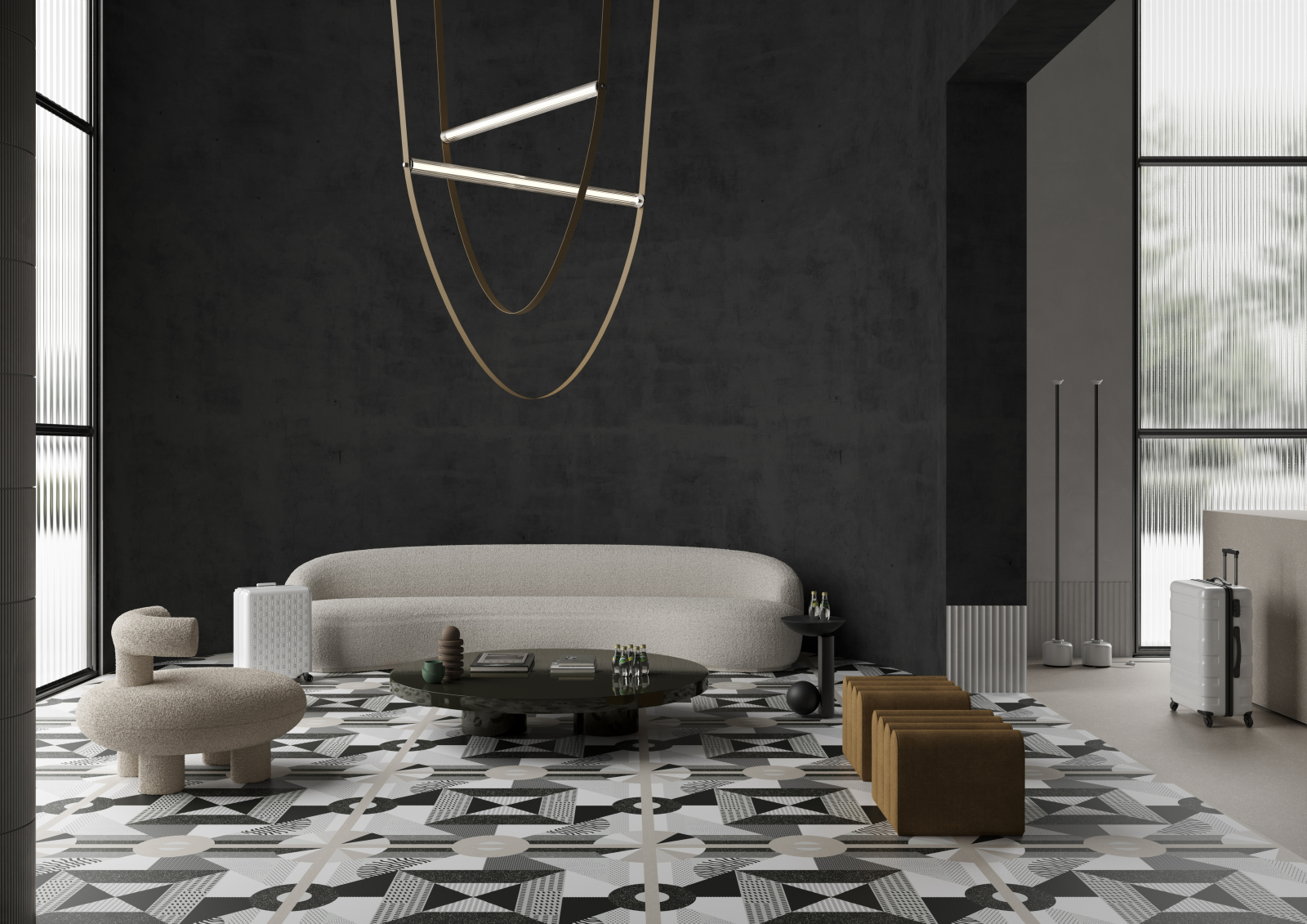 „One” reia tema plăcilor de ciment encaustice, dar într-un format supradimensionat și atrăgător: o placă de 120x120 cu o grosime de 6 mm.