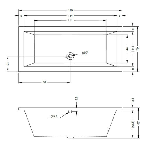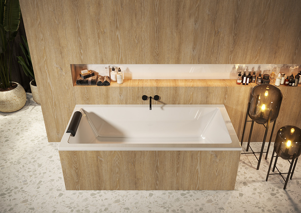 Cadă încorporată, cu margine standard a căzii, acrilic alb lucios, dreptunghiulară cu o formă interioară compactă, scurgere laterală. Disponibilă și cu sistemele cu hidromasaj: Air, Flow, Joy sau Bliss. (vezi recomandari)