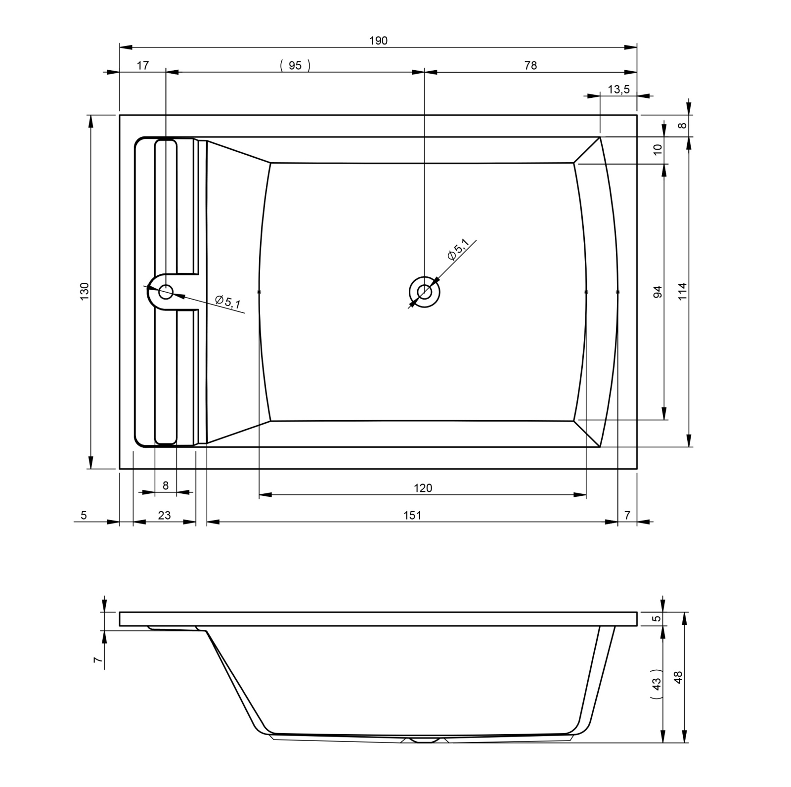 Cadă încorporată, cadă duo din acril alb lucios, cu tetieră mare neagră. Disponibilă și cu sistemele cu hidromasaj: Air, Flow, Joy sau Bliss.