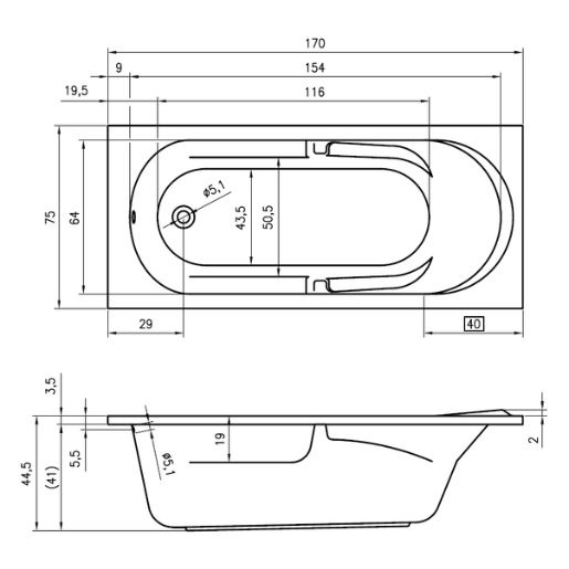 Cădiță încorporată, cadă acrilică albă lucioasă, cu cotiere, scurgere la capătul picioarelor.