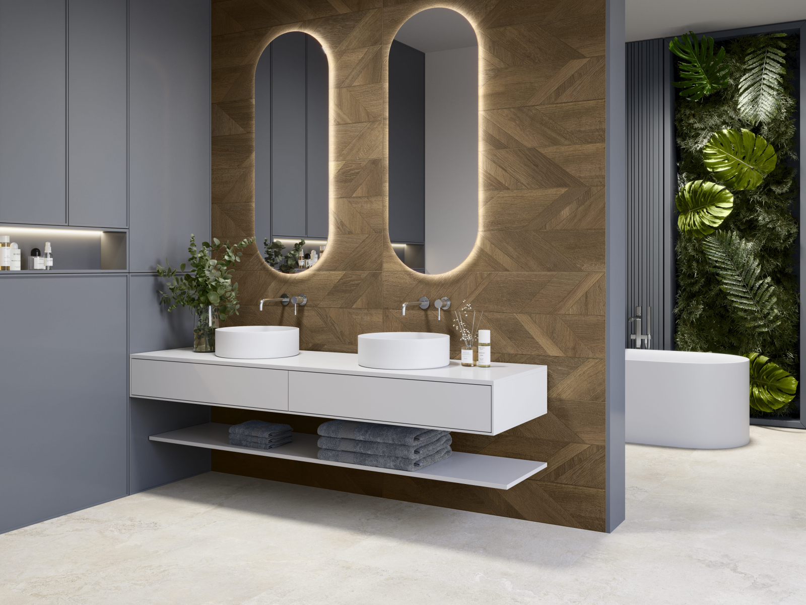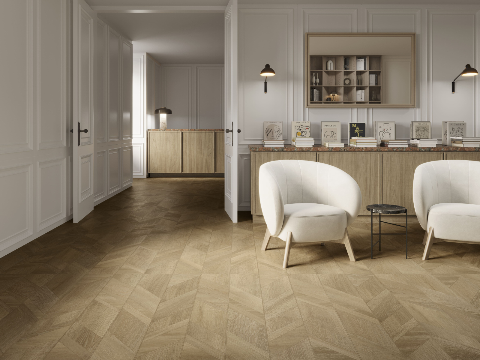 Colecția Oken traduce limbajul lemnului în suprafețe decorative pline de caracter. Designul său geometric, în care fiecare piesă se îmbină ca un mozaic delicat, se joacă cu direcții și texturi pentru a crea compoziții dinamice și elegante. Disponibilă în două nuanțe - Natural și Honey - această serie surprinde esența lemnului cu un realism uimitor. Finisajul său mat, îmbunătățit de tehnica inovatoare Spectra, oferă un relief tactil și vizual subtil care încântă atât atingerea, cât și vederea. Într-un format de 59,5 x 119,2 cm, fiecare piesă devine un element decorativ cu personalitate, capabil să adauge căldură atât podelelor, cât și pereților. Oken este alegerea ideală pentru cei care caută o distincție atemporală, unde tradiția artizanală și designul contemporan se întâlnesc în perfectă armonie.