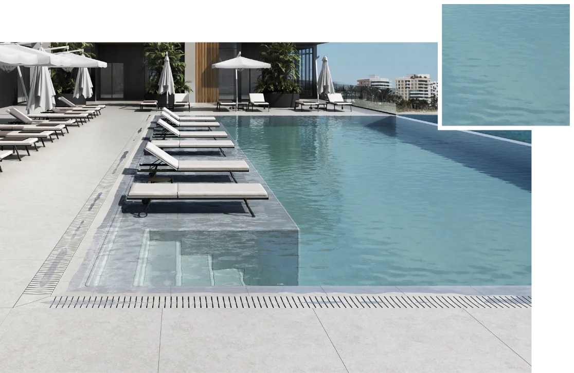 Culoarea apei nu este aleatorie, ci mai degrabă rezultatul unei combinații precise între finisajul gresiei porțelanate, lumină, adâncime și împrejurimi. La Exagres, proiectăm fiecare colecție pentru a oferi nuanțe care transformă apa și se îmbină perfect cu peisajul.