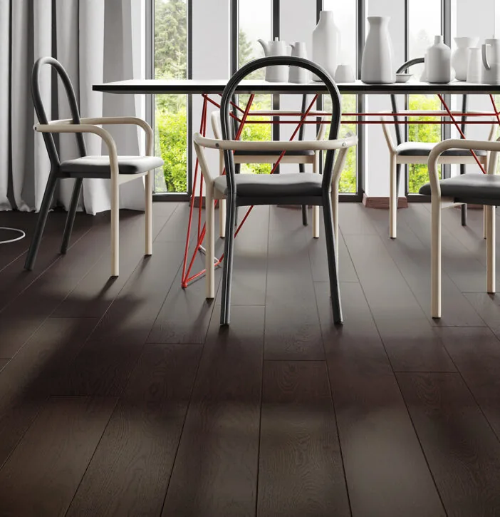 Pardoseala este acoperită cu o culoare intensă de ciocolată negră care evidențiază caracteristicile sale unice. Lacul mat pune în evidență structura naturală a lemnului subliniată prin procesul de periere. Marginile plăcilor au fost accentuate de canelurile de pe cele 4 laturi pentru a le lungi optic.