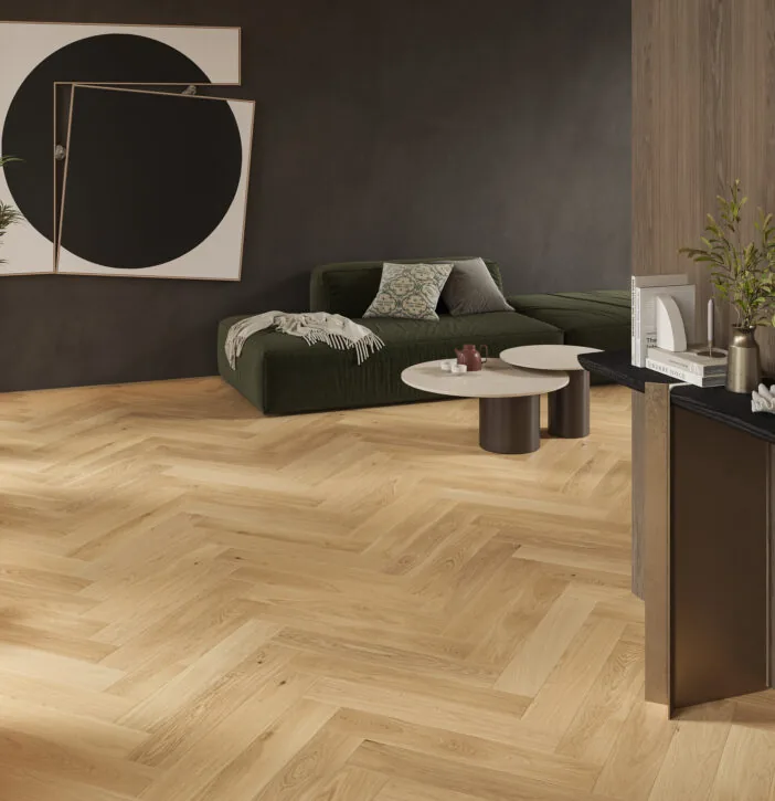 Parchet triplu stratificat din stejar, înnobilată prin procedeul de periere, cu muchii pronunţate subliniază aspectul traditional al lemnului.
