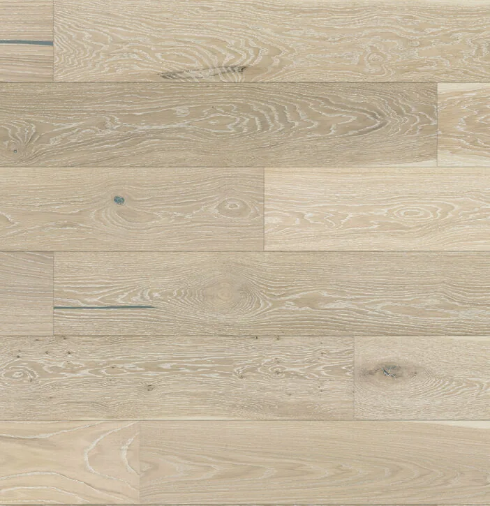 Parchet triplu stratificat din stejar dublu băiţuit. Perierea albă, teșirea celor patru laturi și acoperirea cu lacul alb mat îi confera o eleganță aparte, acompaniind perfect neutrul bejului. Disponibil în versiunea cu 1 lamelă si 3 lamele.