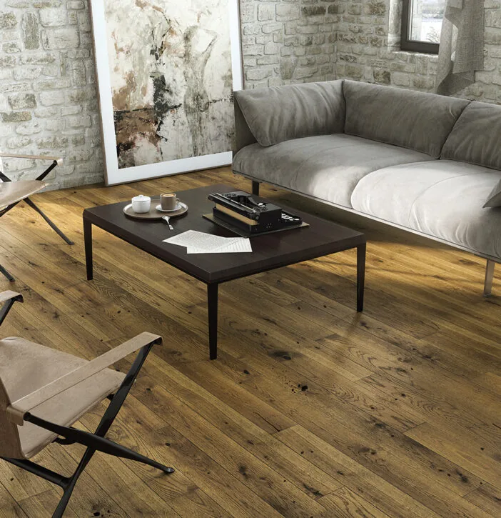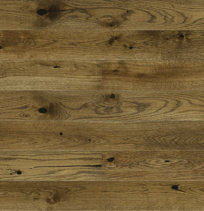 Parchet triplu stratificat din stejar finisat cu o nunaţă de maro închis. Pe linia clară a fibrei apar decolorări şi noduri sănătoase sau noduri mari chituite.