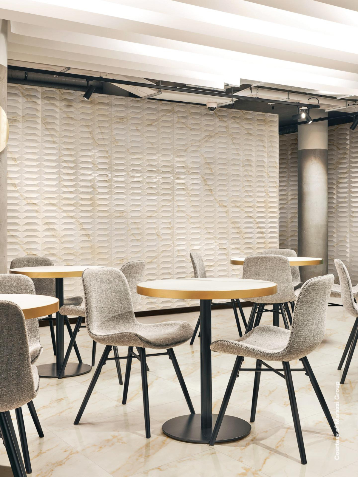Eleganța eternă a celor mai fine marmuri întâlnește designul contemporan într-o colecție de gresie porțelanată ultra-durabilă pentru pardoseli și monoporoasă în pastă albă, cu grosime subțire, pentru plăci de perete. Opt modele diferite de marmură, în dimensiunile de 60x120 cm și 60x60 cm, cu finisaj mat și 58x116 cm și 58x58 cm, în versiune lucioasă, dialoghează cu șase tapet deosebite, în dimensiunea de 30x90 cm. Suprafețele lucioase ale tapetului sunt completate de structuri tridimensionale și decoruri geometrice, care stabilesc un contrast atractiv cu nervurile marmurei, definind o nouă modernitate.