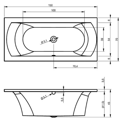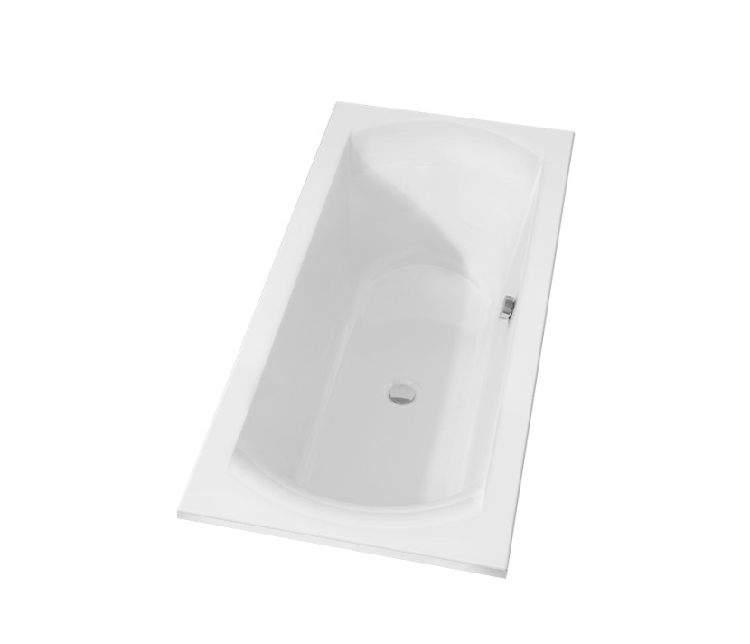 Cadă de baie încorporată, acrilic alb lucios, dreptunghiulară cu interior rotunjit și scurgere laterală.